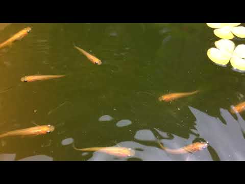 アサザの花の下を泳ぐ母メダカ。このオレンジ系のメダカの子孫がたくさん増えました。